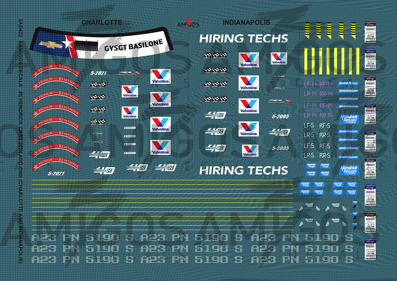 3 Amigos Decals #5 HENDRICK CARS 2024 ADD-ONS (CHARLOTTE AND INDIANAPOLIS) Decal Set 1:24