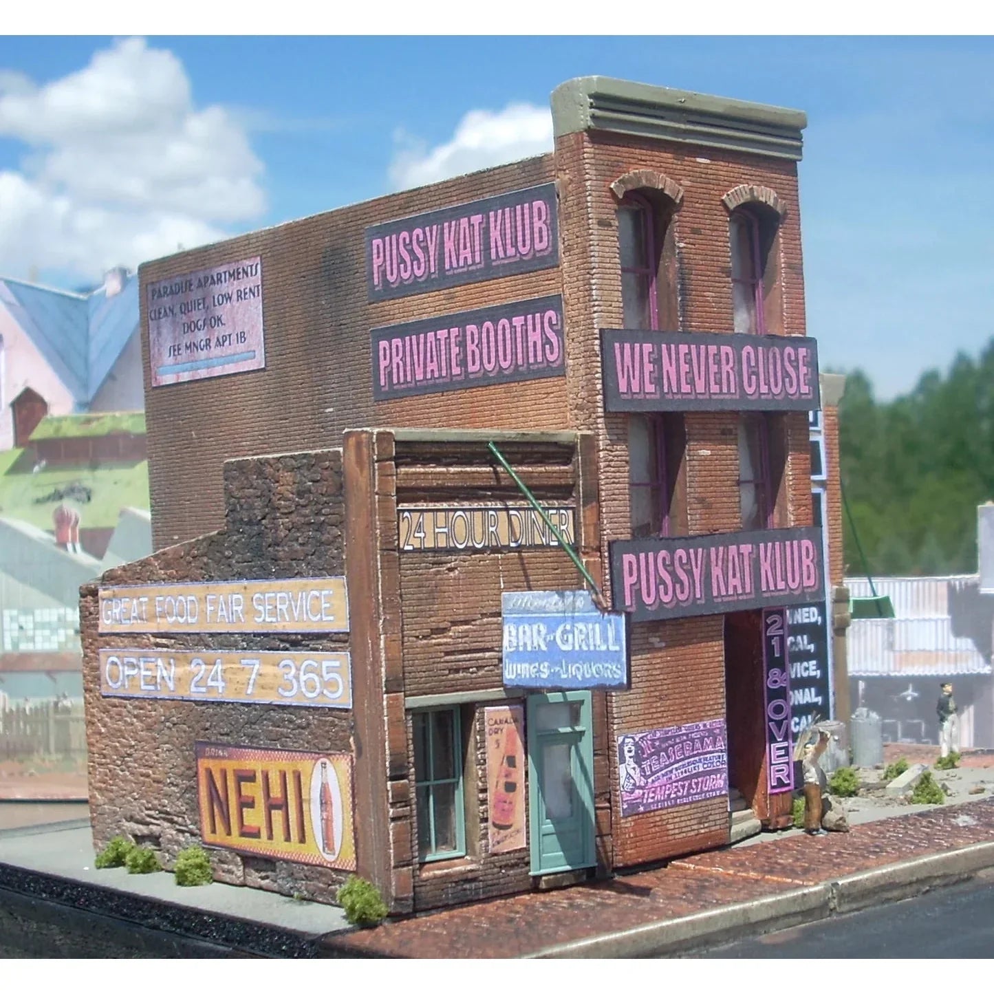 This three building set has a little bit of everything going on. A “Gentlemans Club”, a Downtown Diner & a Mortician. Great signs included with this one. Notice how the mortician stresses how “economical” he is three times. 9″ x 9″.