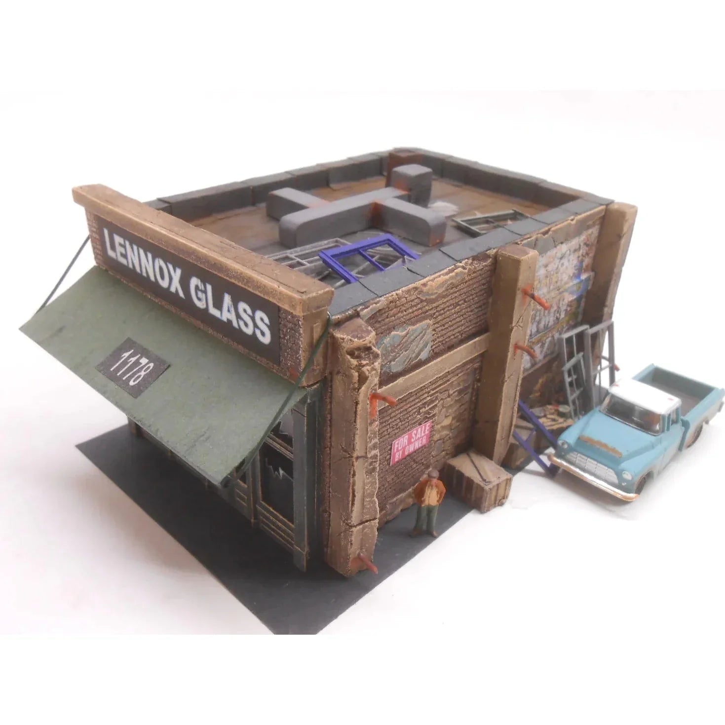 This kit features all new hydrocal castings, custom decals, laser cut "shattered" glass and extra windows to help clutter the place up. Also included plain , unbroken glass if you want to do a straight build. 3" x 5".